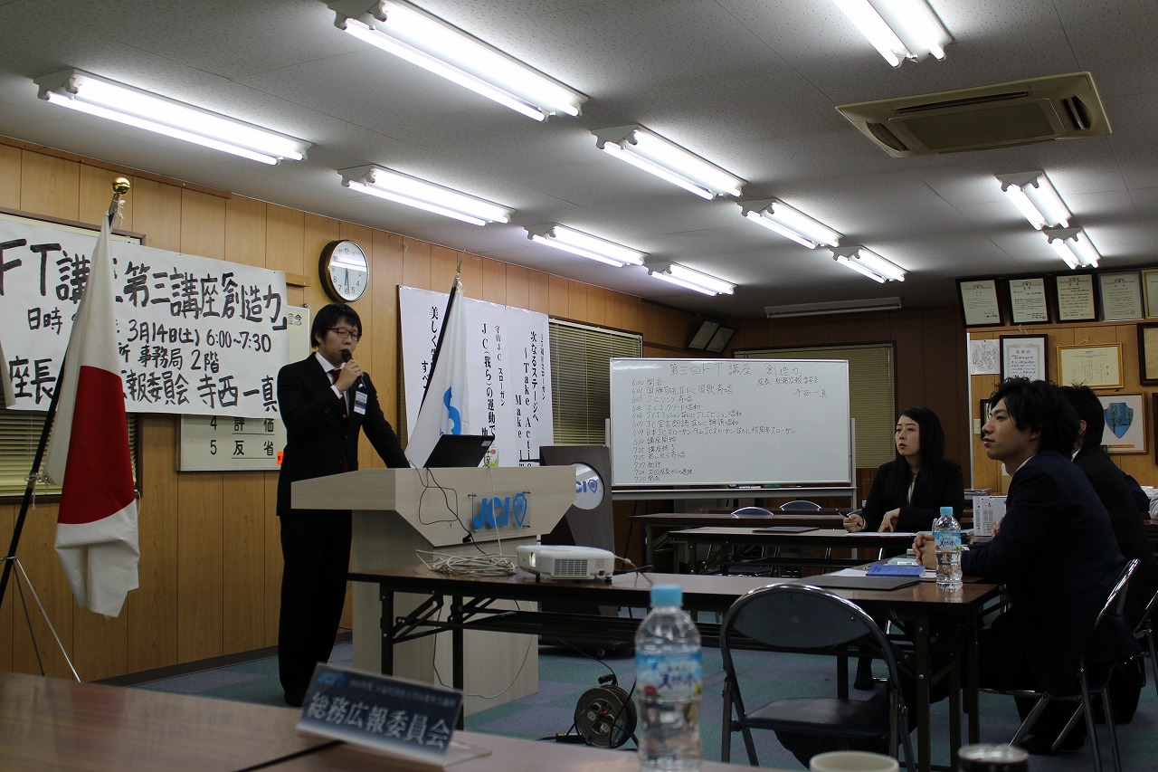3月21日(土)、FT講座第四講座は、「発言力」をテーマに総務広報委員会の前田茂樹君が講座をされました。言葉の力としてX Japanと星野仙一氏の発言についての紹介を交えて話をされました。 |