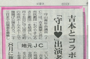 8月15日の創立45周年記念事業である「もりやまふるさと劇団」の劇団員募集に関する記事を、6月11日付けの京都新聞様の朝刊・滋賀面にご掲載いただきました。 |